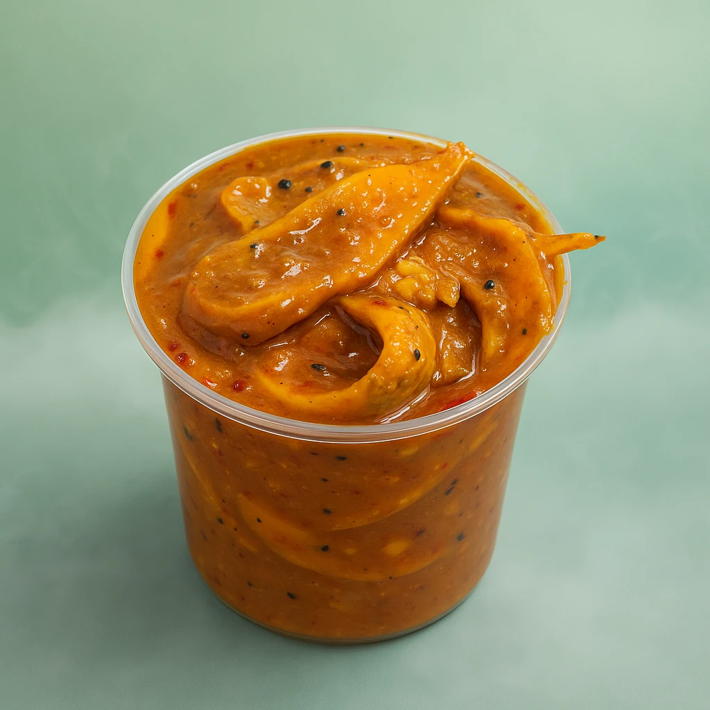 انبه سبز، روغن خردل، سرکه طبیعی، فلفل قرمز، ادویه شرقی، نمک